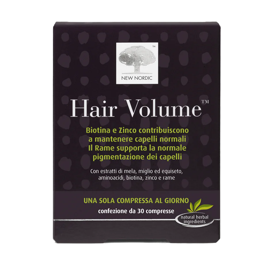 New Nordic Hair Volume™ 90 compresse è un integratore alimentare studiato per favorire la crescita, il volume e la forza dei capelli. La sua formula svedese originale combina estratti naturali di mela, miglio ed equiseto, insieme a rame e biotina, nutrienti che contribuiscono al mantenimento di capelli sani e alla pigmentazione naturale.Hair Volume™ nutre i follicoli dall’interno, migliorando visibilmente la densità e la lucentezza dei capelli. Grazie alla sua efficacia clinicamente testata, i primi risultati possono essere visibili già dopo 2 mesi di utilizzo.
