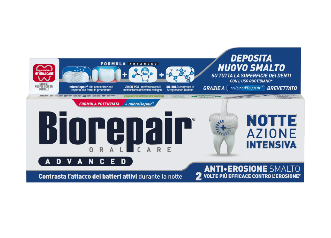 La formula avanzata Biorepair® Intensivo Notte Anti-Erosione è potenziata per contrastare il processo di demineralizzazione dello smalto dei denti che avviene durante la notte. I microRepair®, presenti in alta concentrazione, si depositano sullo smalto riparandolo e proteggendo la superficie dei denti dall’erosione notturna. Zinco PCA e Xilitolo contrastano insieme l’attività aggressiva degli acidi dei batteri, principale causa di demineralizzazione, placca, tartaro e carie. Inoltre lo speciale aroma stimola il flusso salivare notturno per una protezione naturale dello smalto e un alito più fresco al risveglio.