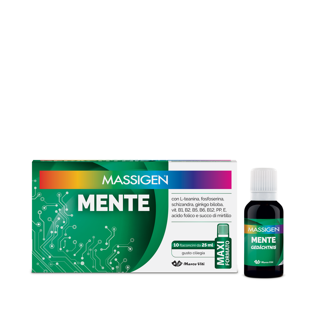 Contiene estratto fluido di schizandra dalle proprietà tonico-adattogene che possono risultare utili nello studio e nelle attività mentali, fosfoserina componente strutturale normalmente presente nelle cellule cerebrali, estratto fluido di ginkgo biloba contribuisce alla funzionalità del microcircolo, acido folico e vitamine B5 e PP che contrastano la stanchezza e l’affaticamento. La formulazione è arricchita dalla presenza di vitamina B1 che favorisce la normale funzione psicologica e del sistema nervoso. Con succo di mirtillo.